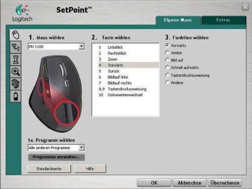 Auf der kabellosen MX1100 Cordless Lasermaus mit geschwungener Form, liegt die Hand optimal auf und die Handballen werden effektiv gestützt. Das MicroGear Präzisionstastenrad hat zwei Scroll-Modi (schnell / präzise) und 8 programmierbare Tasten. Einstellbare Auflösung (bis zu 1.600 dpi). Mit dem mitgelieferten USB-Stecker lädt sich die Maus während der Arbeit vollständig auf. Alternativ kann die Maus über das USB-Kabel mit dem mitgelieferten Netzadapter an einer Steckdose aufgeladen werden.Bildergalerie (Klicken Sie zum Vergrern)